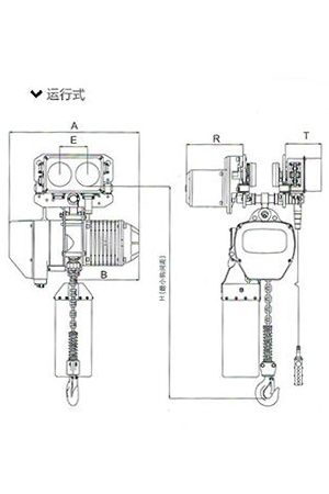 | 運(yùn)行式環(huán)鏈電動葫蘆(0.25T-5T) 尺寸參考: | ||||||