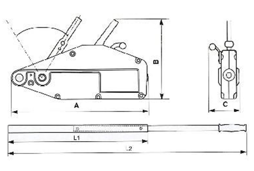 額定起重量(KG) | 額定收拉力N | 額定前進(jìn)行程 | 鋼絲繩直徑(mm) | 鋼絲繩安全系數(shù) | 整機(jī)安全系數(shù) | 最大載荷(KG) | 整機(jī)重量(KG) | 整機(jī)尺寸 | L1(mm) | L2(mm) | ||||||