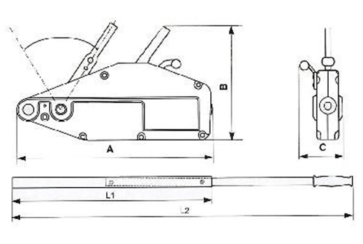 型號 | 額定載荷 | 額定載荷時手拉力 | 額定載荷時手柄往復(fù)一次鋼絲繩行程 | 鋼絲繩直徑 | 葫蘆重量 | 外形尺寸 |